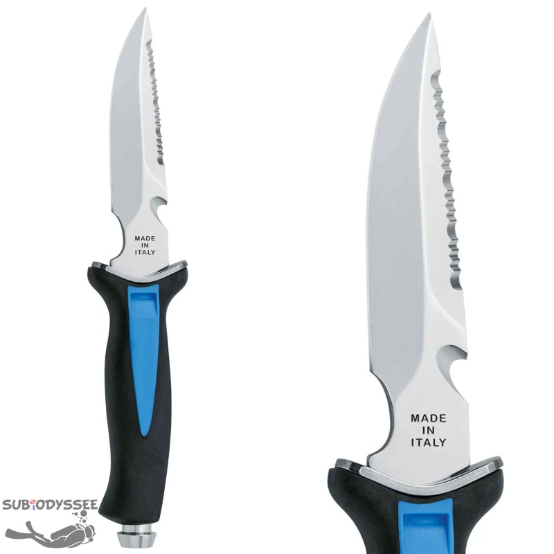 Très beau couteau inox de fabrication italienne à gaine rigide double sécurité. La lame traverse le manche & se termine par une masselotte, elle est dotée d’une partie coupante & d’une partie sciante ainsi que d’un coupe fil.