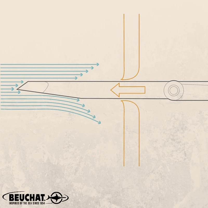 – La rainure directionnelle de la pointe planante orientée vers le bas permet un échappement du flux d’eau vers le bas, ce qui accroit encore l’effet de sustentation de la pointe.