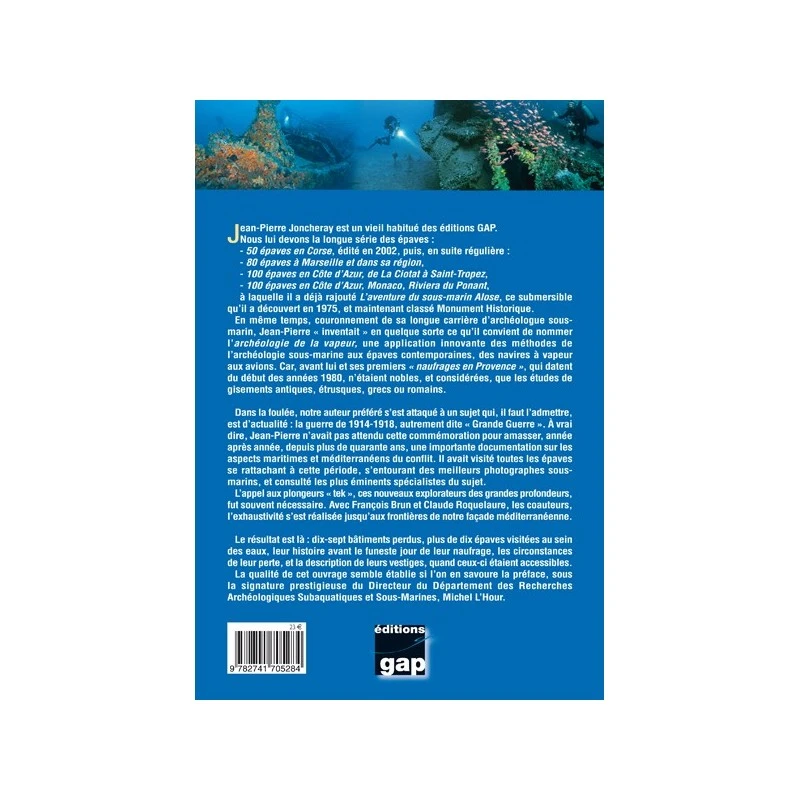 Les épaves de la grande Guerre des Editions Gap : 17 bâtiments perdus, plus de 10 épaves visitées, leur histoire avant le funeste jour de leur naufrage, les circonstances de leur perte, & la description de leurs vestiges, quand ceux-ci étaient accessibles.