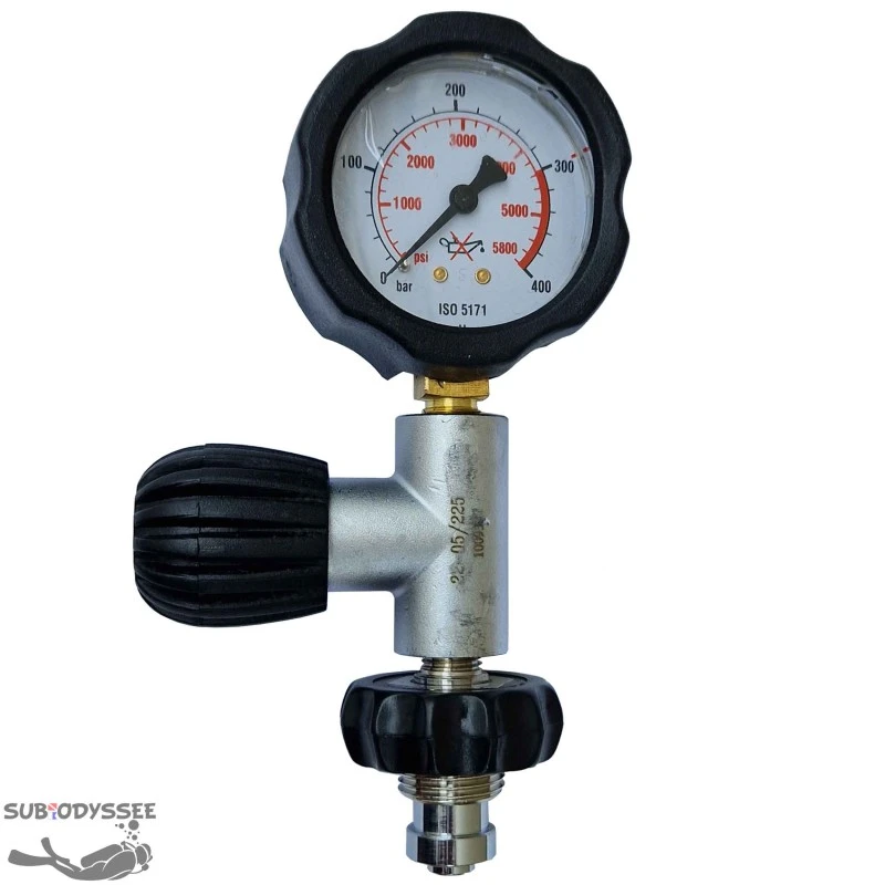 Manomètre de surface pour le contrôle de pression des bouteilles de plongée. Volant de purge large, facile à manipuler.