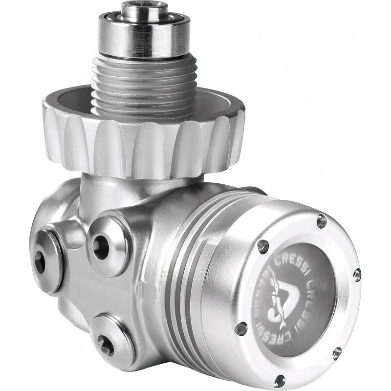Le premier étage T10 SC CROMO se distingue de la gamme des détendeurs Cressi à membrane compensée par un mécanisme disposé sur un axe perpendiculaire à l’entrée d’air, créant une forme « T ».