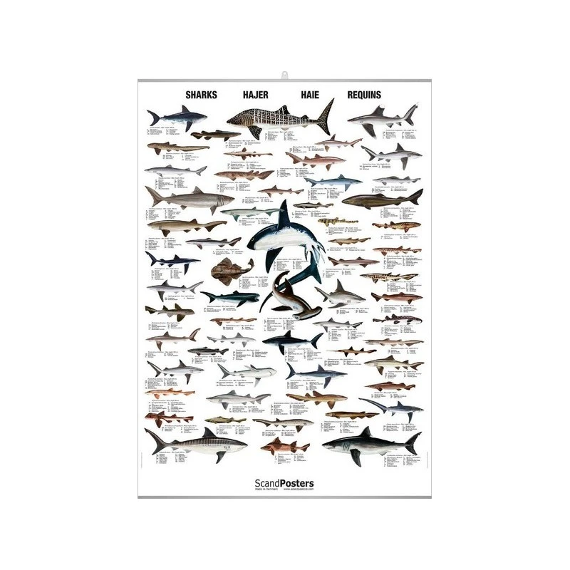 60 espèces de requins les plus répandus au monde. Noms d’espèces indiqués en plusieurs langues dont latin, français, anglais, allemand, italien, espagnol…