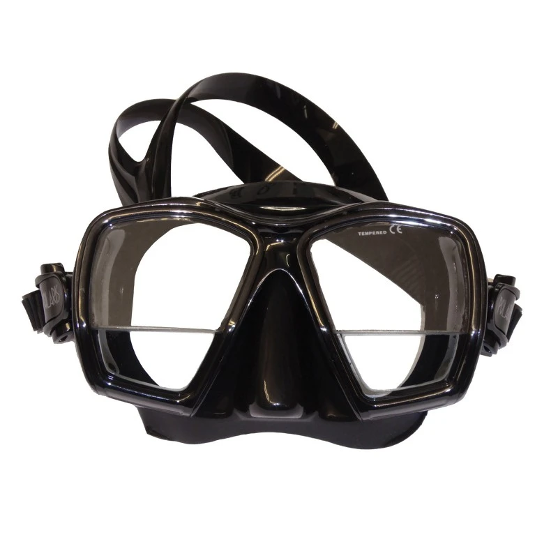 Masque Polaris QUADRA avec verres correcteurs positifs incorporés en silicone noir.