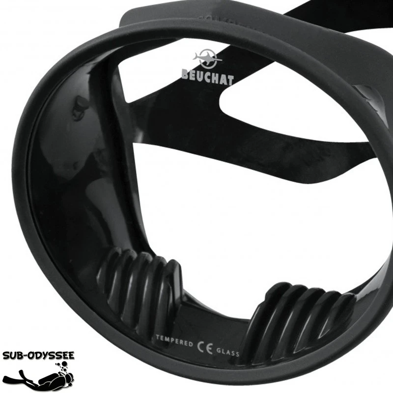Bossages de compensation à soufflets (la déformation du masque ne s’applique que sur la partie nasale lors des manoeuvres de compensation & n’affecte pas l’étanchéité de la jupe).