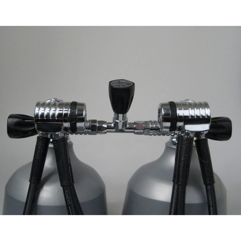 Libère l’accès aux robinets de la bouteille en cas de plongée avec un bloc bi.