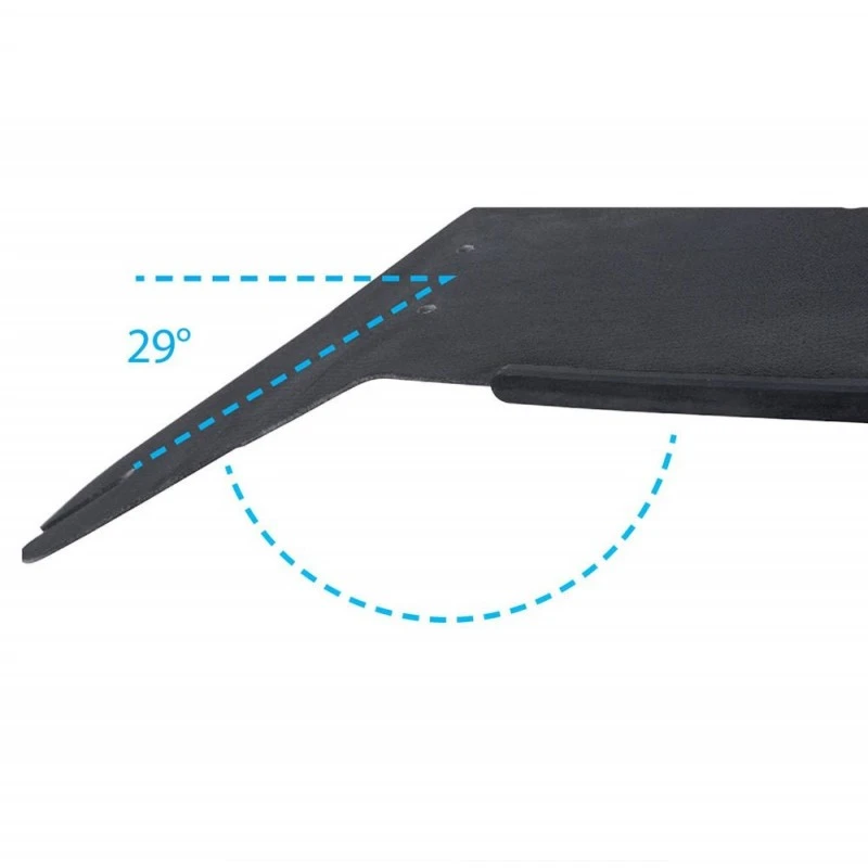 La voilure forme un angle de 29 degrés avec la chausson, pour limiter les temps morts dans les phases ascendantes & descendantes du palmage, & en améliorer la performance dynamique.